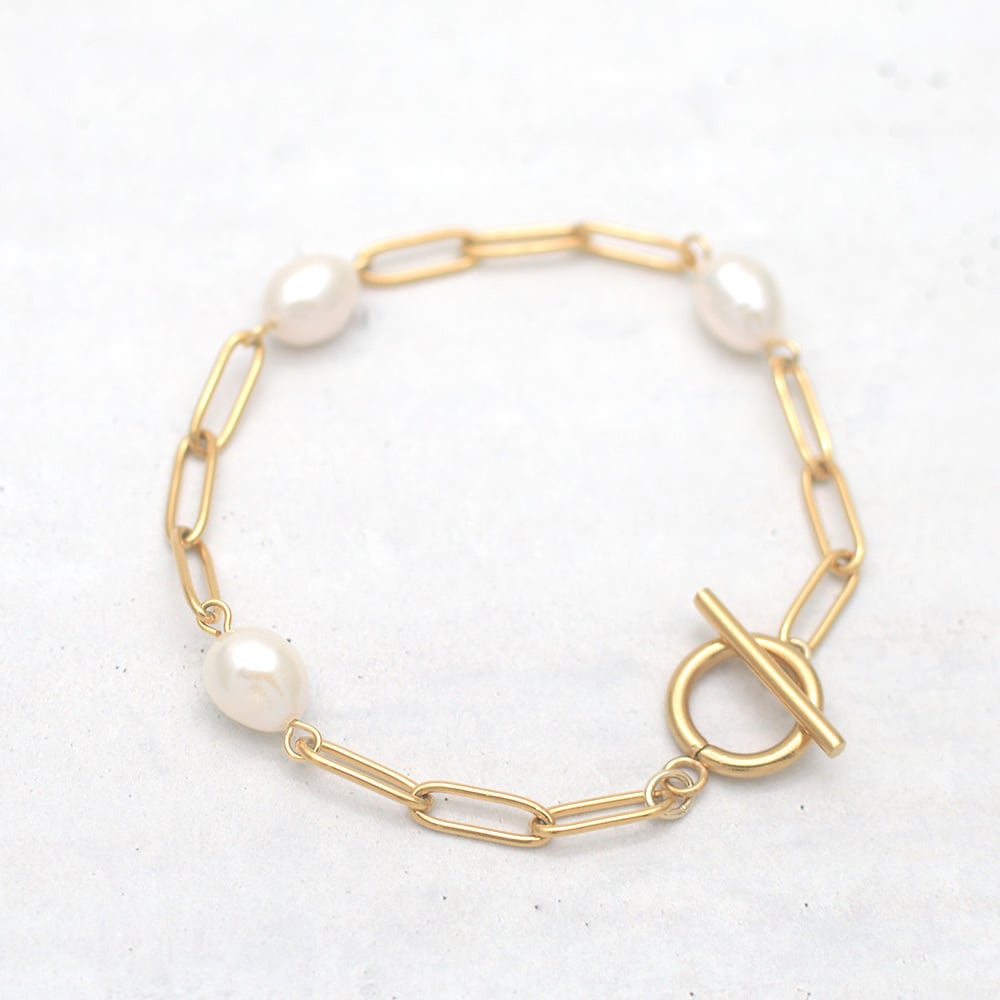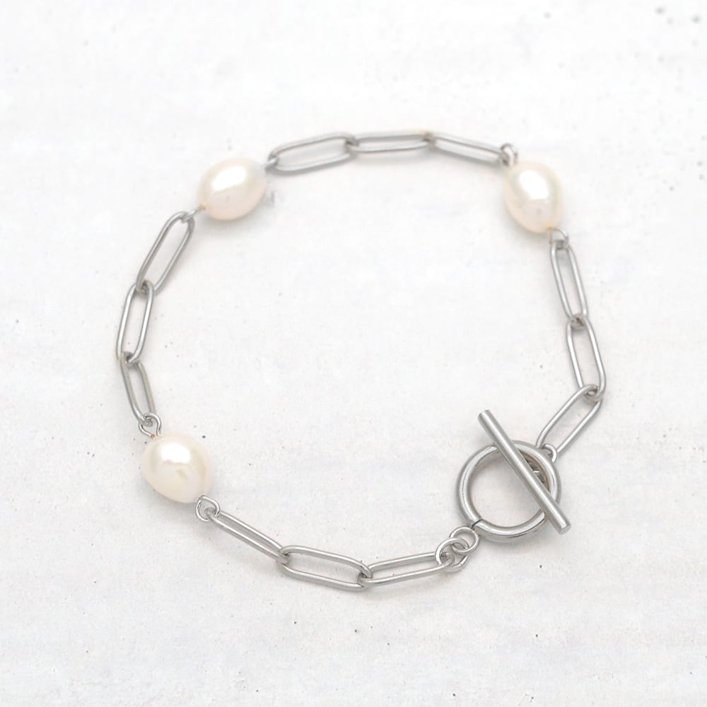 クリップチェーン 3粒 ステーション バロックパール ブレスレット 淡水パール サージカルステンレス製 / br-013