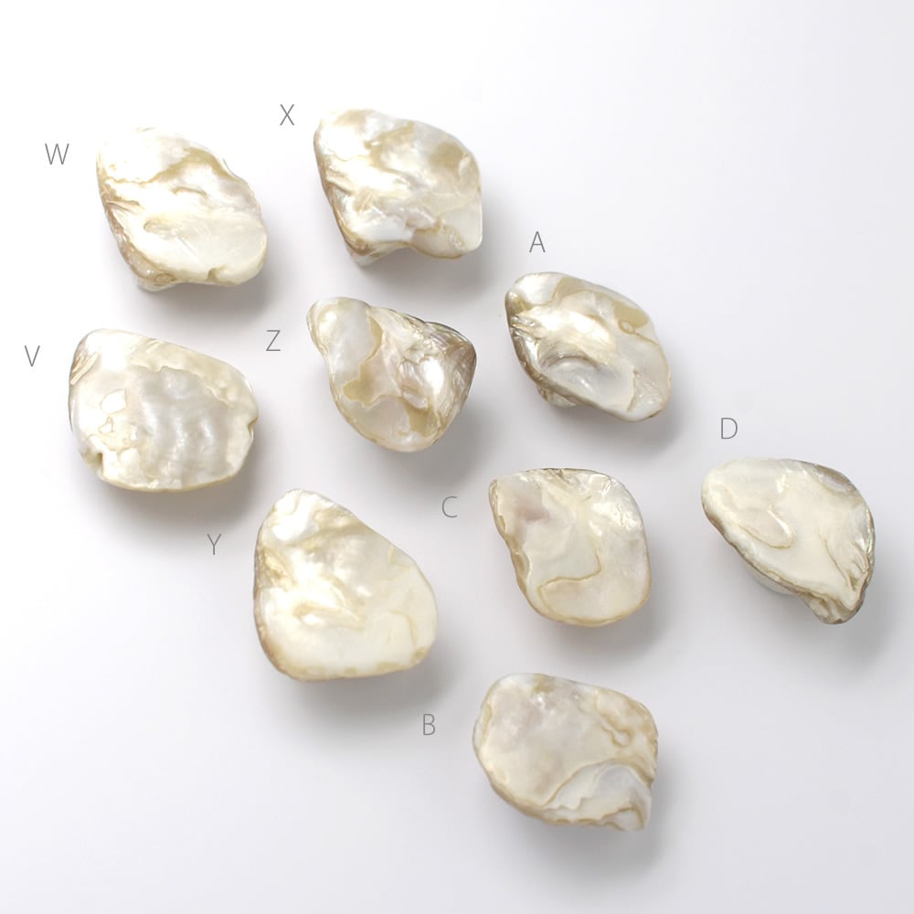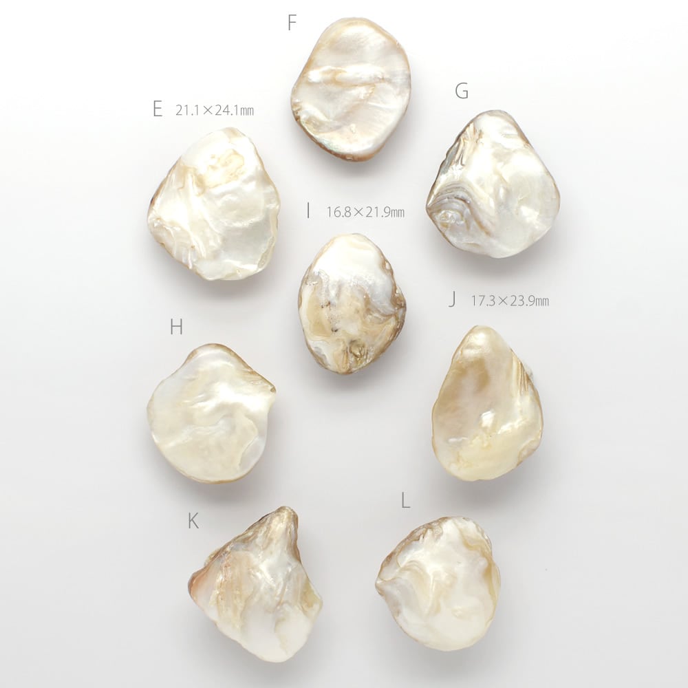 真珠をはぐくむ貝(真珠母貝)のこと。貝の内側にある真珠層を用いた素材。真珠とおなじように輝きと美しい光沢を放ちます。